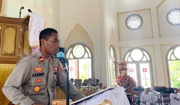 Penyampaian pesan kamtibmas sekaligus memperkenalkan diri itu disampaikan Kapolsek Julkisno di Gereja Bethlehem Hulaliuw, ketika 500 jemaat selesai mengikuti ibadah Minggu dipimpin Ketua Majelis Jemaat GPM Hulaliu, Pendeta Ine Rotosouw, STh.