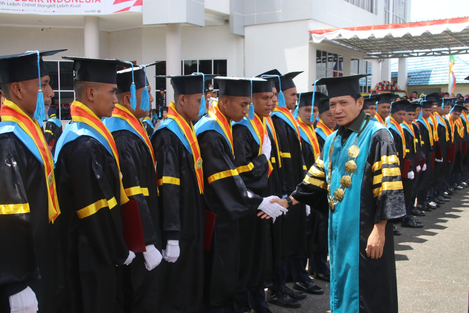 Pj. Sekretaris Daerah Maluku, Sadali Ie hadir dalam acara tersebut. Kedatangannya disambut Wakil Koordinator Politeknik Perikanan dan Kelautan Kampus Maluku, Dr. Achmad Jais Ely, ST, M.Si saat menuju Aula Politeknik Kelautan dan Perikanan Kampus Maluku untuk mengikuti acara wisuda Diploma III.