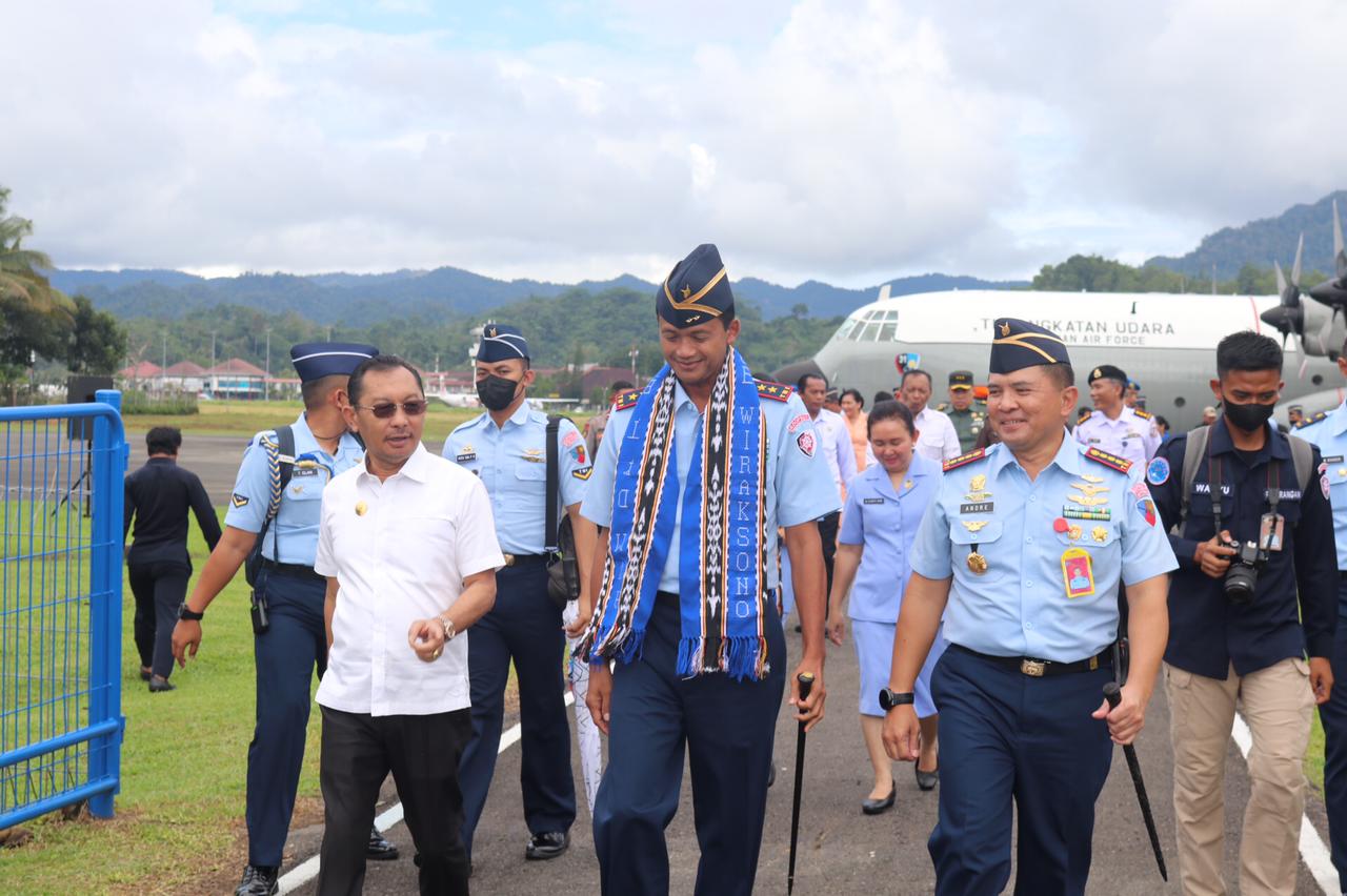 Tiba menggunakan pesawat TNI AU Indonesian Air Force, dengan nomor punggung A-1314, Marsekal bintang dua ini, disambut tarian-tarian yang diperagakan siswa siswi dari SD Angkasa Pattimura.