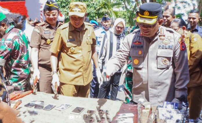 Ambon, Maluku.news – Pj. Wali Kota Ambon, Bodewin M. Wattimena menghadiri pemusnahan 25 item barang bukti perkara Tindak Pidana Umum (PIDUM) yang sudah mempunyai kekuatan hukum tetap, yang dilaksankan pada halaman Baileo Rakyat (DPRD) Kota Ambon, Belakang Soya, kecamatan Sirimau, Selasa (14/3/2023).