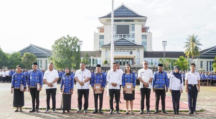 Ambon, Maluku.news – Sebanyak 385 Pegawai Pemerintah dengan Perjanjian Kerja (PPPK) dan Calon Pegawai Negeri Sipil (CPNS) lingkup Pemerintah Kota (Pemkot) Ambon, menerima Surat Keputusan (SK) pengangkatan oleh Penjabat Pj. Wali Kota Ambon, Bodewin M. Wattimena, saat mempin apel staf, di Lapangan Merdeka, Rabu, (03/04/2024).