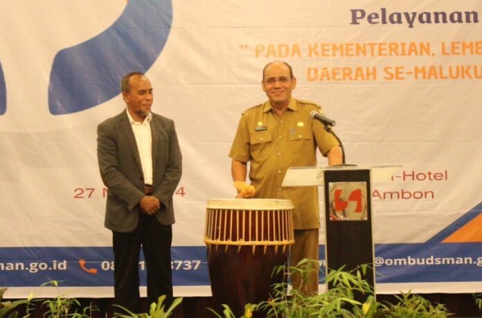 Ambon, Maluku.news – Pelaksana Harian Sekretaris Daerah Maluku Dr. Ir. Syuryadi Sabirin,M.Si didampingi Kepala Perwakilan Ombudsman RI Provinsi Maluku Hasan Slamat, membuka secara resmi Sosialisasi Penilaian Kepatuhan Penyelenggaraan Pelayanan Publik pada Kementerian, Lembaga, dan Pemerintah Daerah se-Maluku, yang ditandai dengan pemukulan tifa, pada Senin (27/5/2024), berpusat di Swiss Bel-Hotel Ambon.