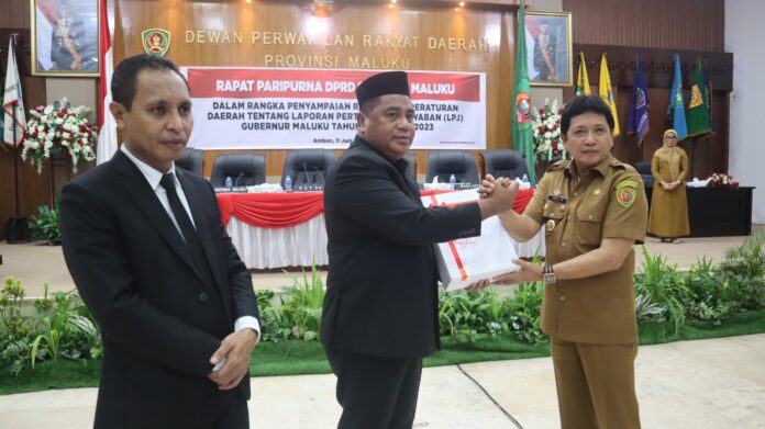 Ambon, Maluku.news – Dalam Rangka Penyampaian Rancangan Peraturan Daerah tentang laporan Pertanggungjawaban (LPJ) Gubernur Maluku Tahun Anggaran 2023, maka Dewan Perwakilan Rakyat Daerah (DPRD) Provinsi Maluku, menggelar Rapat Paripurna, berpusat di Kantor DPRD Maluku, Selasa (11/06/2024).