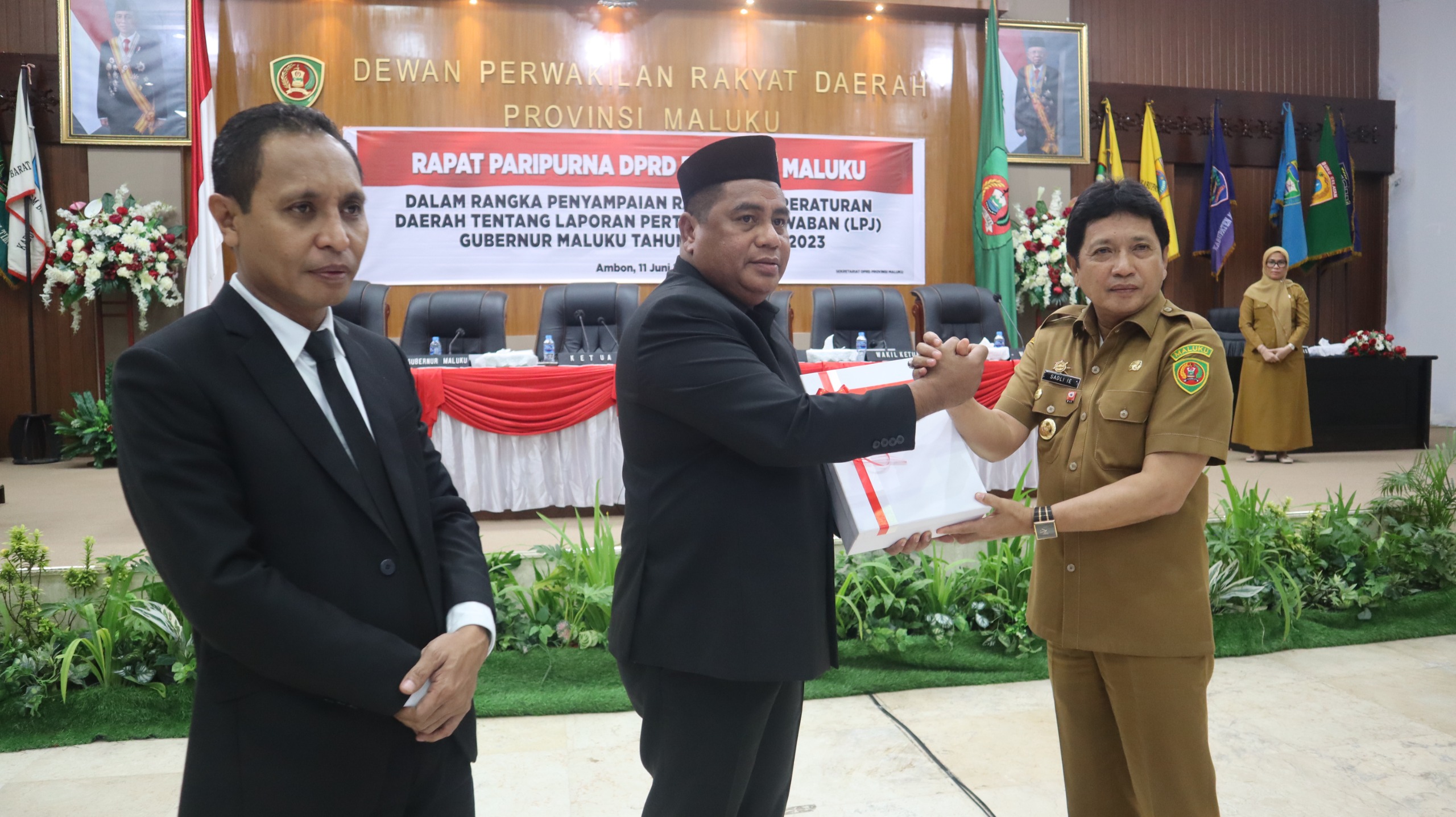 Selanjutnya Penjabat Gubernur Maluku Ir. Sadali Ie, M.Si., IPU menyerahkan menyerahkan Rancangan Peraturan Daerah Provinsi Maluku Tentang Pertanggungjawaban Pelaksanaan APBD Tahun Anggaran 2023 kepada Ketua DPRD Provinsi Maluku Benhur G. Watubun, ST.