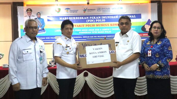 Ambon, Maluku.news – Sukseskan Pekan Imunisasi Nasional (PIN) Polio, Penjabat Gubernur Maluku Ir. Sadali Ie, M.Si. IPU, menyerahkan secara simbolis Vaksin Polio NOPV2, kepada Penjabat Walikota Ambon Dominggus N. Kaya, S.Sos., M.Si, pada Rabu (17/07/2024), berpusat di Kantor Dinas Kesehatan Provinsi Maluku,