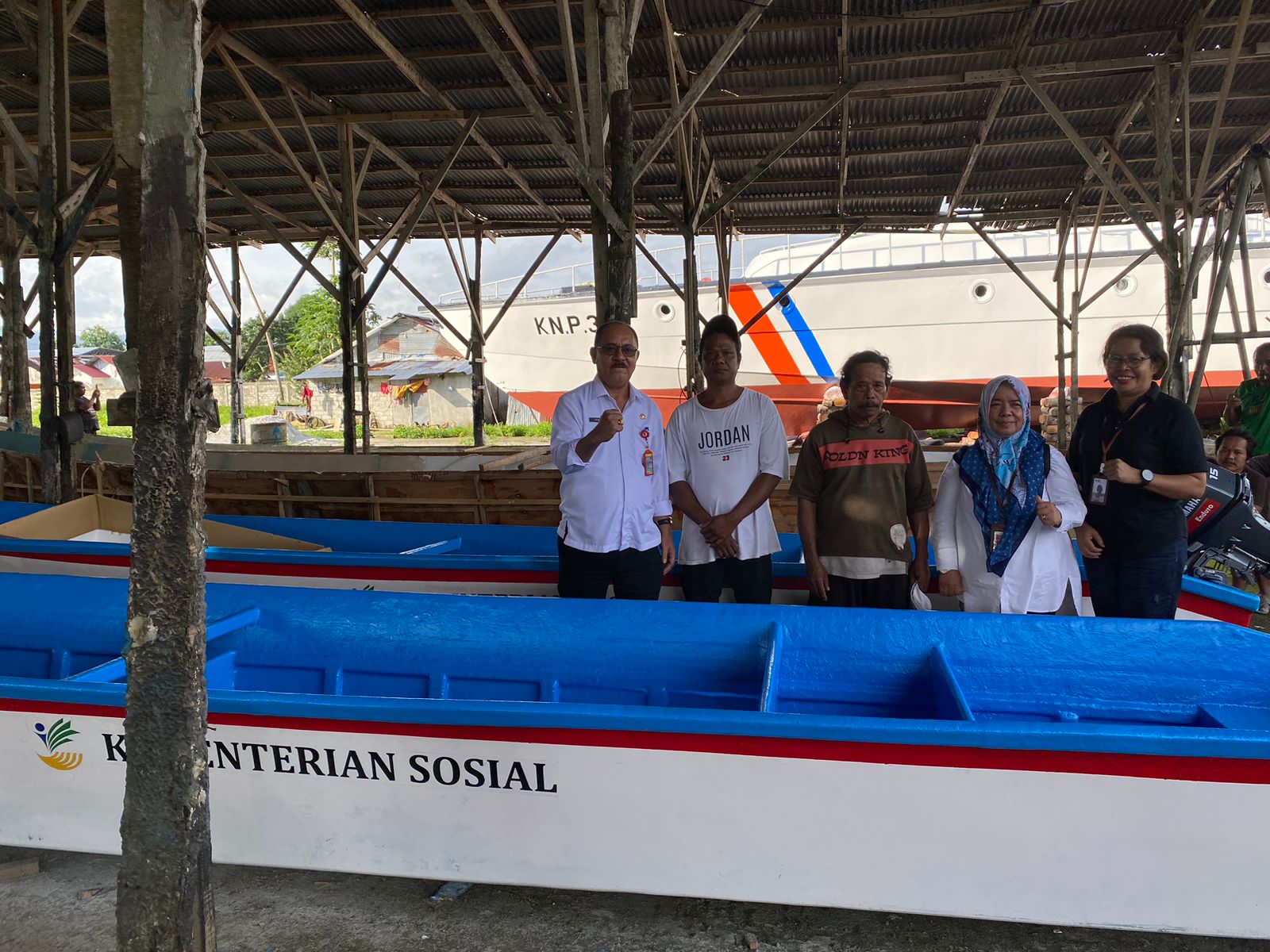 Penyerahan bantuan dilaksanakan di kantor pembuatan perahu fiber, CV. Fajar Bahari Maritim, Desa Laha, Kecamatan Teluk Ambon, Rabu (14/08/2024) dihadiri Kepala Dinas Sosial Kota Ambon,Sirjhon Slarmanat.
