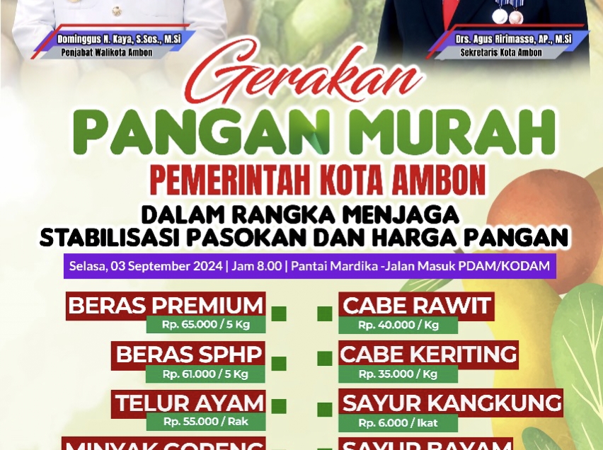 Ambon, Maluku.news – Memasuki bulan September, Pemerintah Kota (Pemkot) Ambon kembali akan menggelar Program Gerakan Pangan Murah (GPM) pada Selasa (03/09/2024) besok.