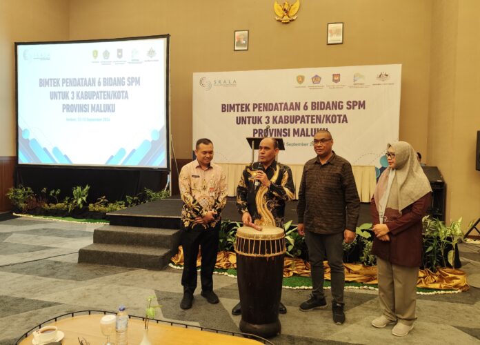 Ambon, Maluku.news – Pelaksana Harian Sekretaris Daerah Maluku Syuryadi Sabirin, membuka secara resmi, pelaksanaan Bimbingan Teknis Pendataan 6 Bidang Standar Pelayanan Minimal (SPM) untuk 3 Kabupaten/Kota di Provinsi Maluku yakni Kabupaten Aru, Kabupaten Maluku Tengah, dan Kota Tual, yang ditandai dengan pemukulan tifa, pada Kamis (12/9/2024) berpusat di Hotel Santika Premier Ambon.