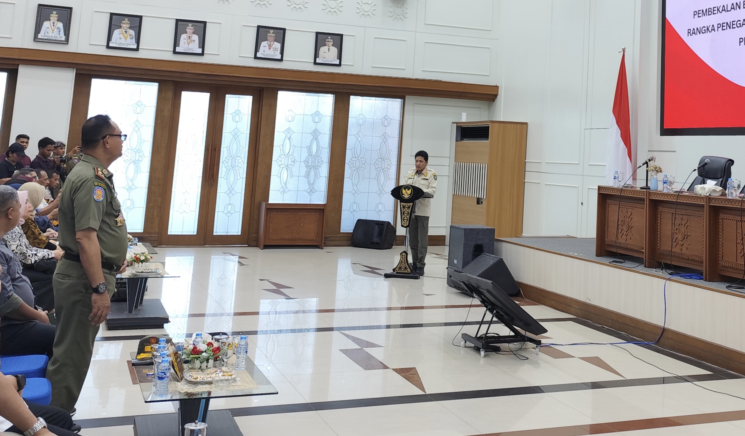 Ambon, Maluku.news – Penjabat Gubernur Maluku Sadali Ie, memberikan arahannya, pada acara Pembekalan Bagi Anggota Satuan Polisi Pamong Praja (Satpol-PP) Provinsi Maluku dalam rangka Penegakan Peraturan Daerah dan Sukses Pelaksanaan Pemilihan Kepala Daerah, pada Jumat (11/10/2024), bertempat di Aula Lantai 7 Kantor Gubernur Maluku.
