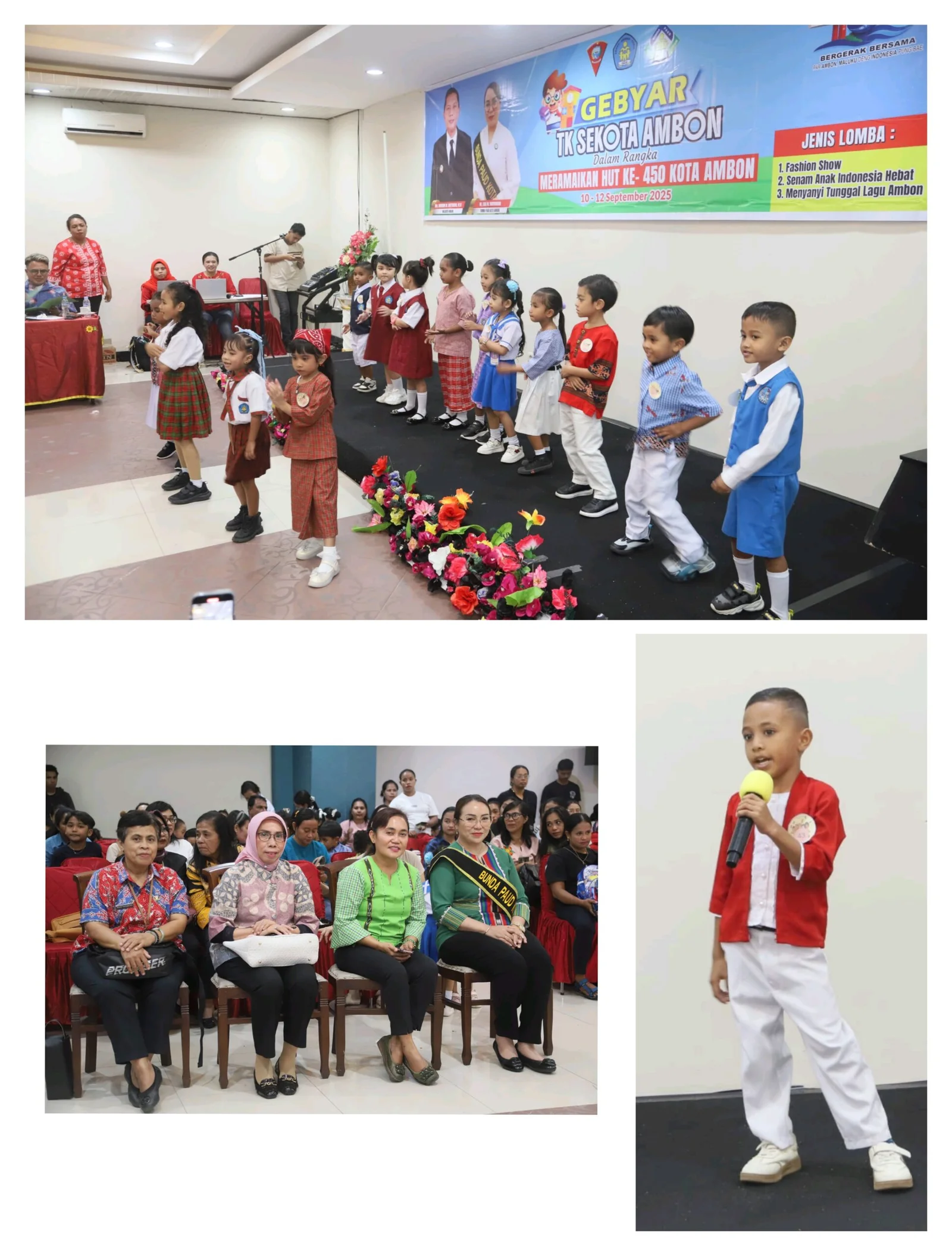AMBON, Maluku.news – Suasana meriah terlihat di Hotel Elisabeth saat kegiatan Gebyar Taman Kanak-Kanak (TK) se-Kota Ambon digelar, Rabu (10/9/2025). Kegiatan yang berlangsung selama tiga hari ini merupakan bagian dari rangkaian perayaan HUT ke-450 Kota Ambon.