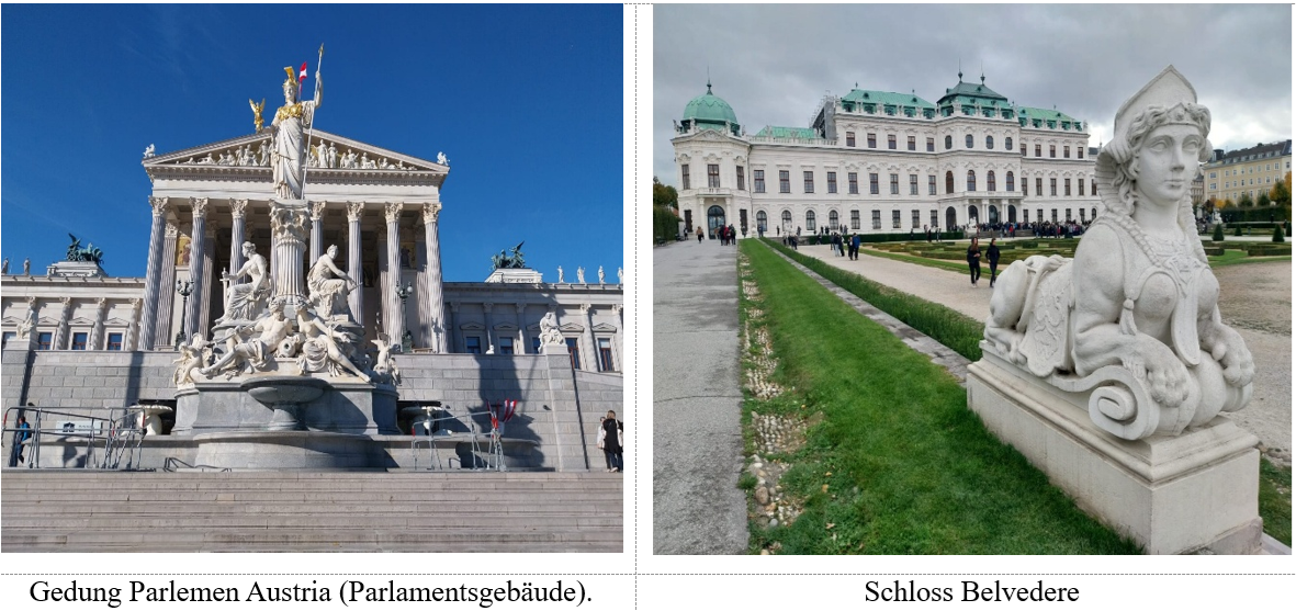 Gedung Parlemen Austria (Parlamentsgebäude) dan Schloss Belvedere, dengan taman yang luas dan indah serta bangunan istana yang megah, menjadi contoh nyata bagaimana sejarah dan estetika dapat dipelihara secara konsisten. Penanganan sanitasi, pengelolaan sampah, dan penyediaan air bersih berpadu harmonis dengan layanan publik yang rapi dan presisi. Ruang terbuka dengan akses luas dan inklusif tersebar di seluruh penjuru kota, mulai dari taman-taman yang tertata indah, pelataran gedung, hingga trotoar lebar yang ramai oleh pejalan kaki. Warga Wina memanfaatkan transportasi umum secara optimal; beragam moda tersedia, mulai dari bus, trem, hingga kereta listrik, yang menjangkau seluruh sudut kota dengan mudah, murah, dan cepat. Pembangunan kota berlangsung secara teratur, fungsional, dan ramah lingkungan. Lanskap sosial dan budaya di Wina terasa unik: modern, namun tetap manusiawi dan beradab.